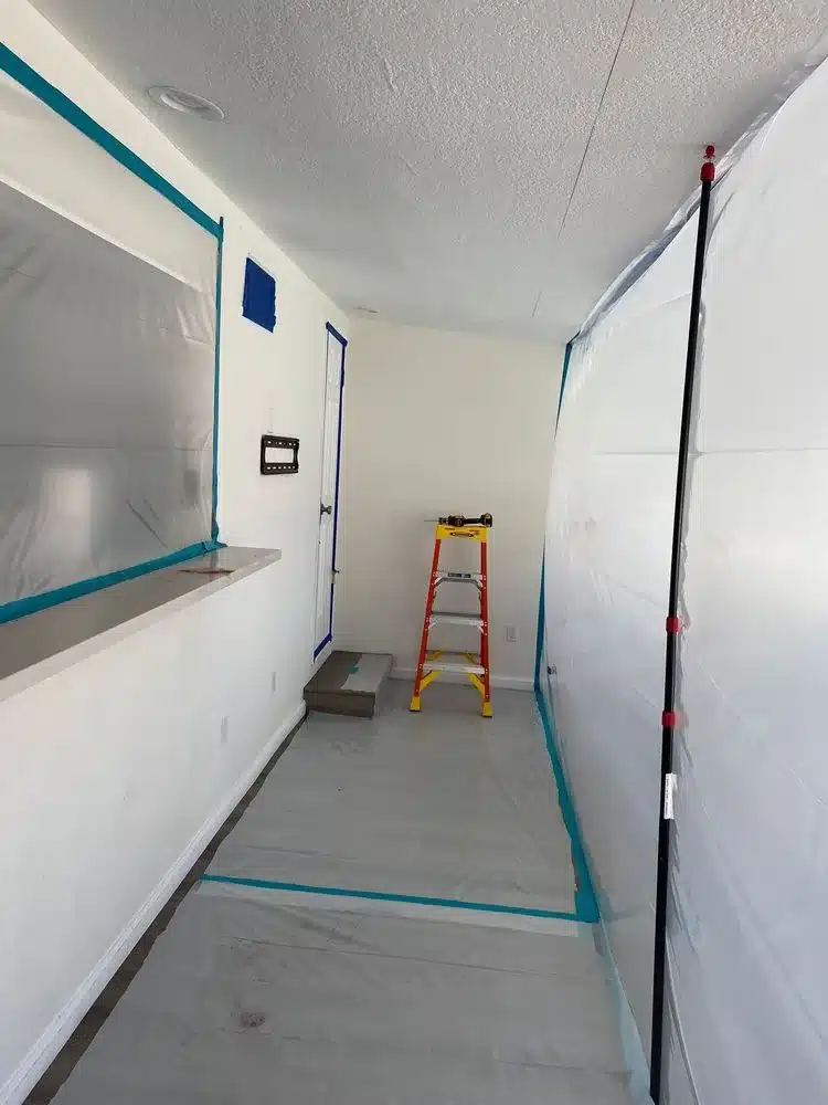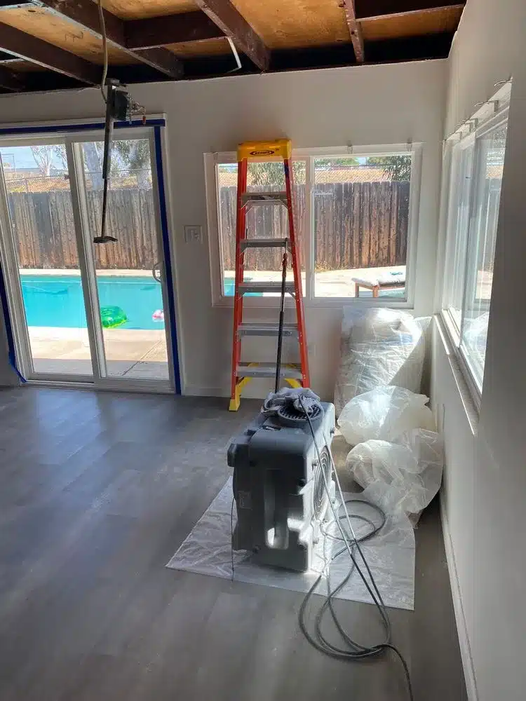 White Glove Restoration recently completed a mold remediation project in the ceiling of a living room in La Mesa, CA. As with any mold situation, our first priority was containment. We carefully sealed off the affected section of the living room from the adjoining kitchen and remaining living space to prevent the spread of mold spores. Protective barriers were set up to shield the walls, floor, door, HVAC vent, and even the step, ensuring the rest of the home stayed safe and clean.